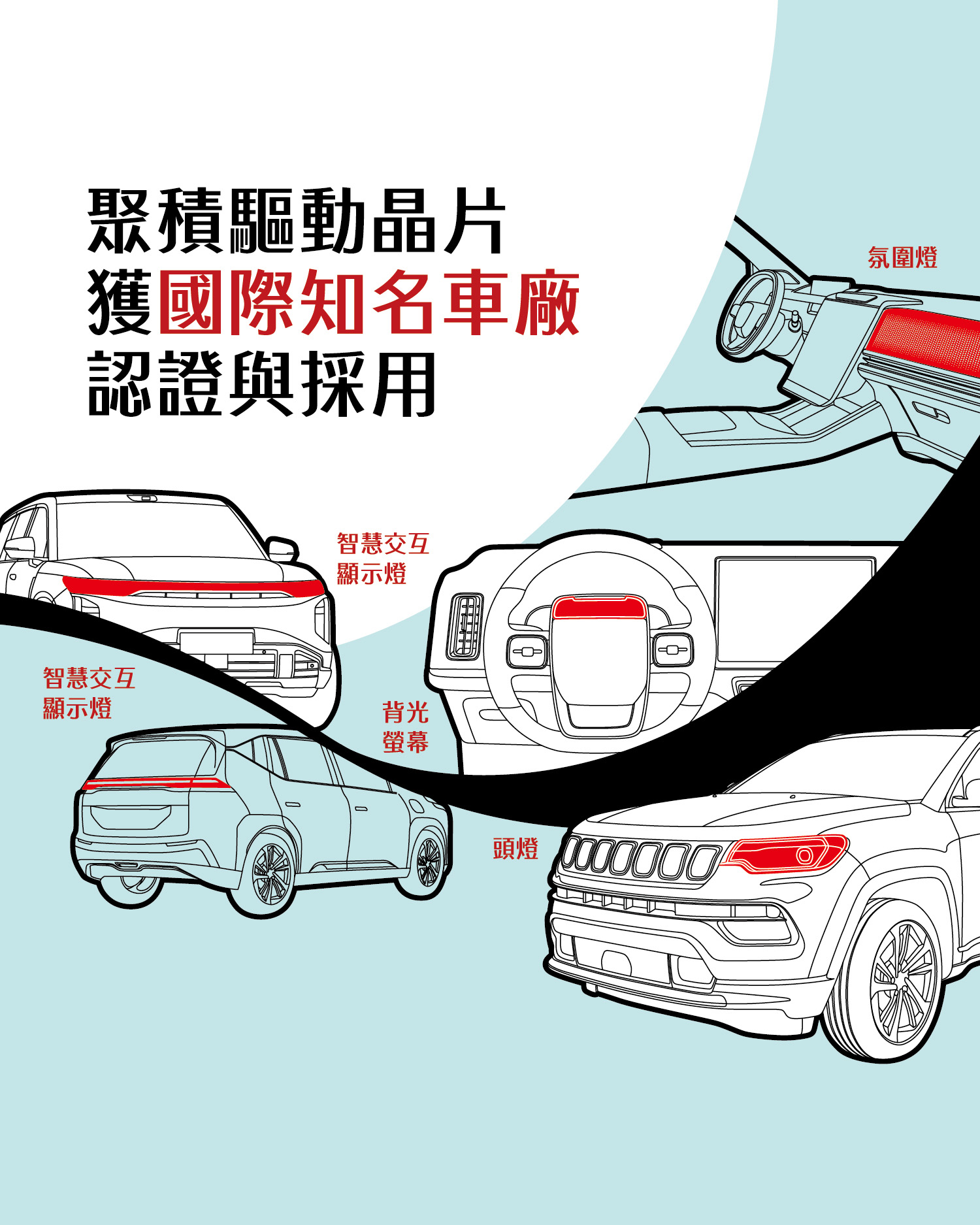 Innovate For Light 聚積科技結合了創新技術與對LED驅動晶片設計的熱情,成為顯示屏與照明產業中的領導品牌,是LED領域中提供關鍵解決方案的最佳企業。 驅動晶片 車用晶片 顯示模組 驅動晶片 車用晶片 顯示模組