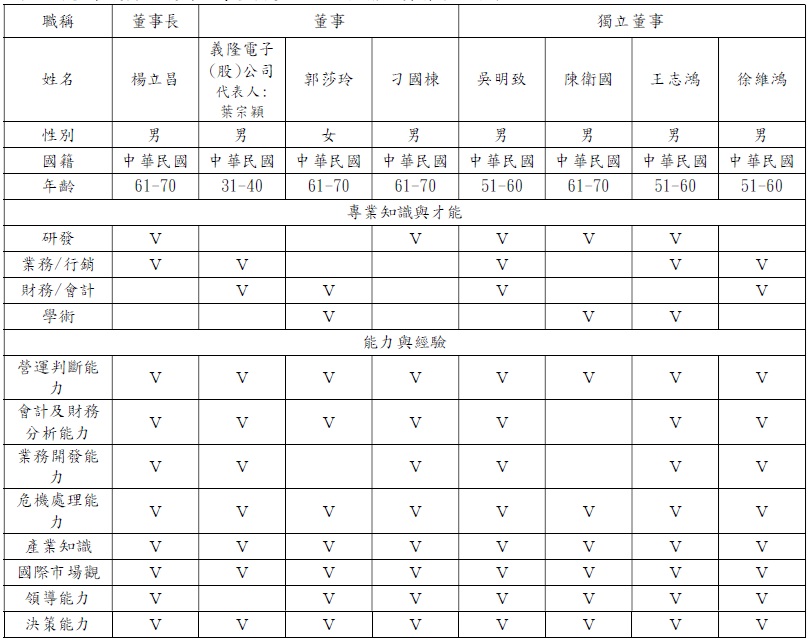 二、專業知識與技能:專業背景(如法律、會計、產業、財務、行銷或科技)、專業技能及產業經歷等。