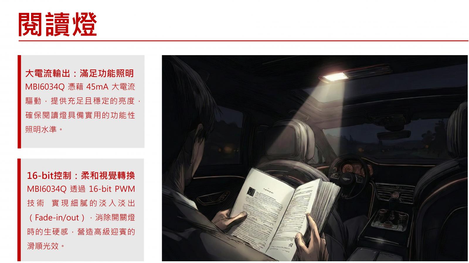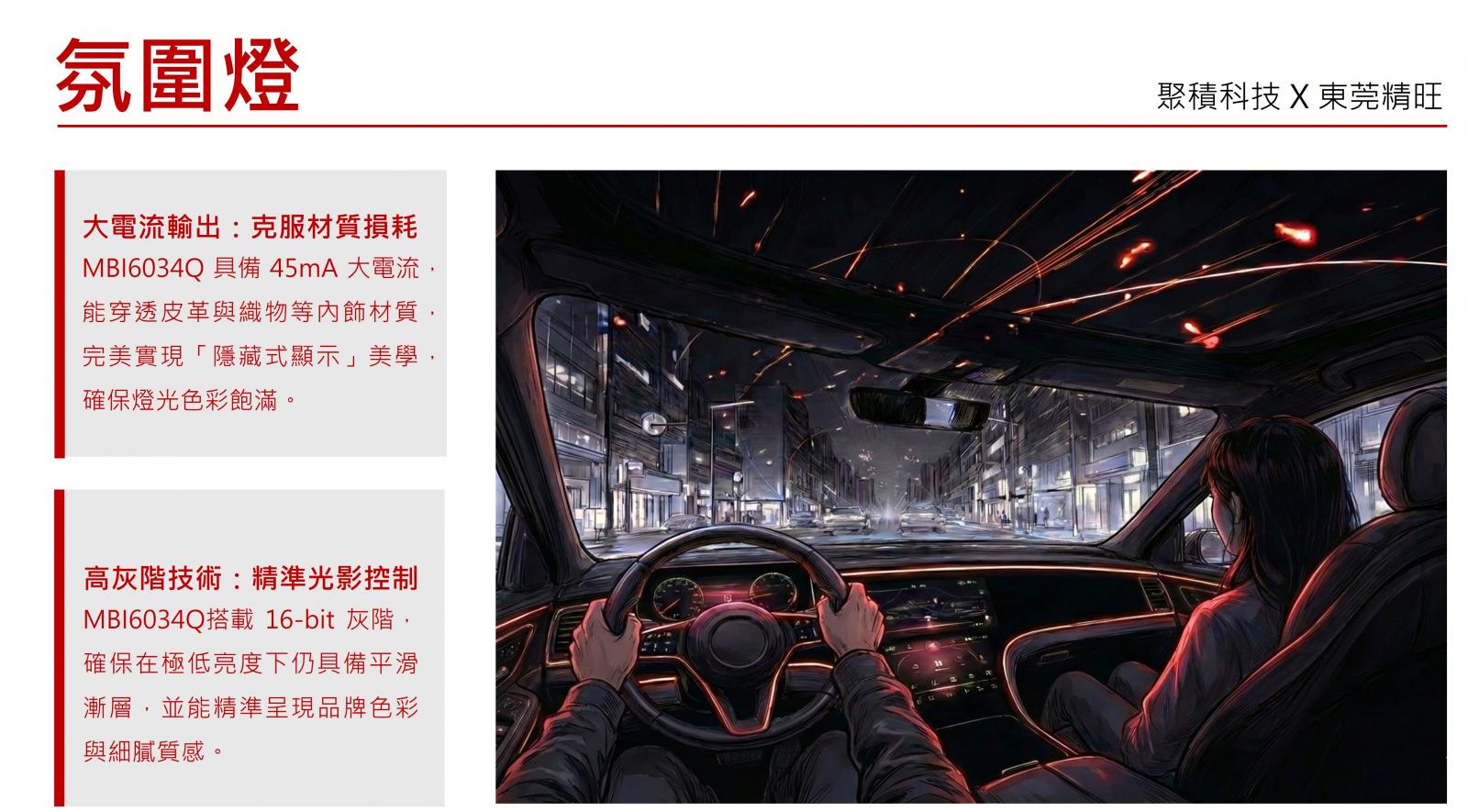 聚積科技展示驅動晶片MBI6034Q的強大通用性。現場之所以將氛圍燈與閱讀燈這兩項性質迥異的應用皆採用MBI6034Q驅動晶片,關鍵原因在於其具備 45mA的大電流輸出能力。這項關鍵規格讓它能輕鬆應對不同的光學挑戰: