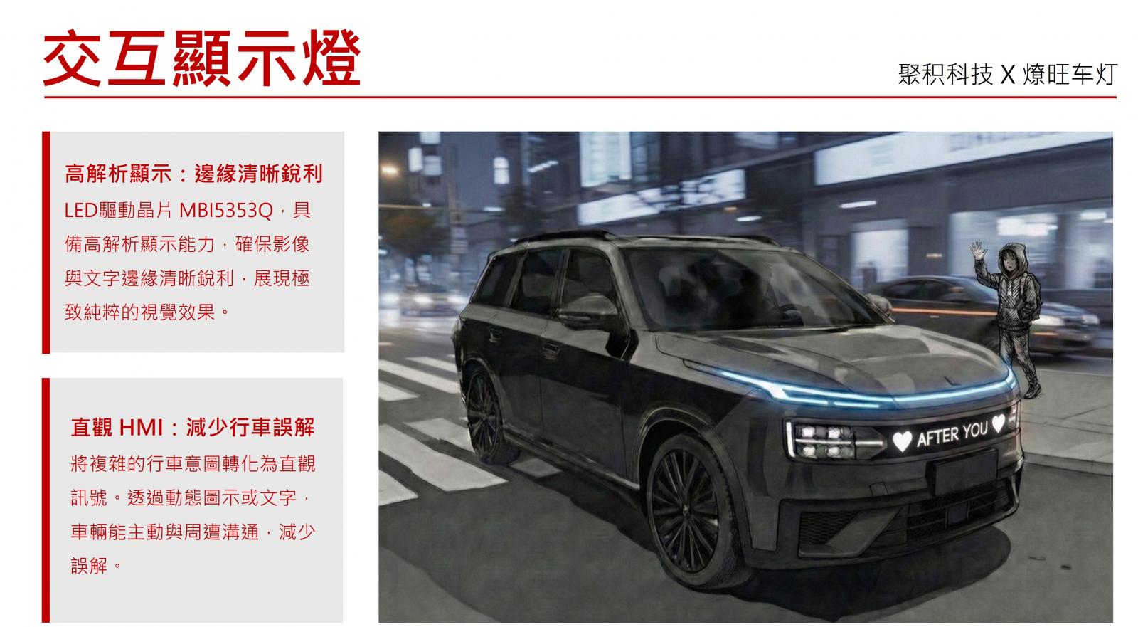 展位上,聚積科技透過兩款截然不同的應用,展示了車頭照明如何從單純的照明工具,進化為溝通介面與美學載體:
